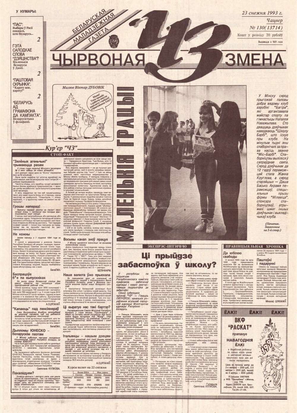 «Беларуская маладзёжная» — рэспубліканская грамадска-палітычная незалежная газета. (1994 - 2002) - беларуская газэта, дадатак да аднайменнай радыёстанцыі. Зарэгістраваная ў сакавіку 1994 году. У ёй друкаваліся расшыфроўкі радыйных гутарак, анонсы этэраў і ўсё, што не зьмяшчалася ў радыёфармат. Калі радыёстанцыю зачынілі, газэта засталася. Галоўны рэдактар — Тацьцяна Мельнічук. Традыцыйны фармат — 8 старонак А3. Газэта асьвятляла нараджэ... Болей »