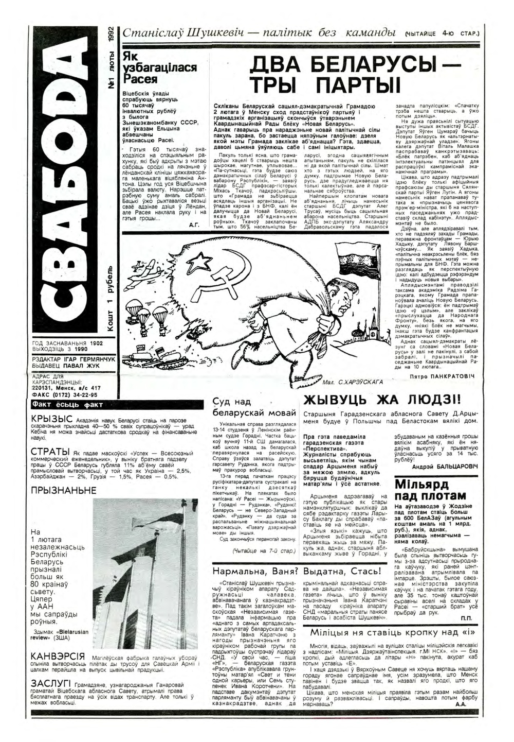 «Свободные новости плюс» — информационно-аналитический еженедельник. Издается с сентября 2002 года. Учредители: Белорусская научно-промышленная ассоциация и промышленно-коммерческая компания «Белфакс». За текст рекламы несет ответственность рекламодатель. Болей »