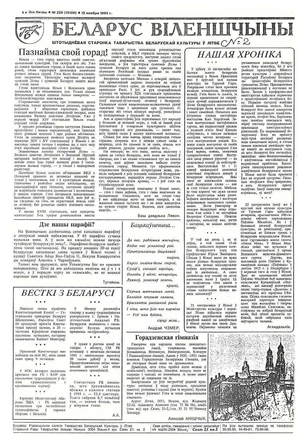 «Беларус Віленшчыны» — штотыднёвая старонка Таварыства Беларускай Культуры Ў Літве. Выдавец: Рэдакцыйная калегія Таварыства Беларускай Культуры ў Літве. Старшыня Рады Таварыства Хведар Нюнька. Болей »