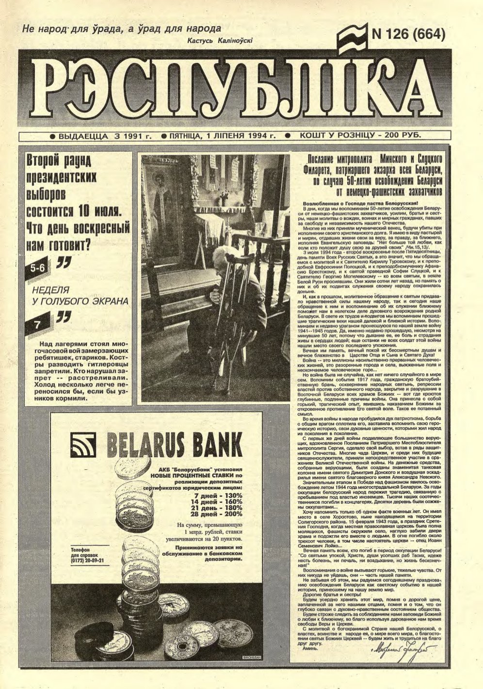 «Рэспубліка» — газета для тых, хто самастойна прымае рашэнні. Заснавальнік - Савет Міністраў Рэспублікі Беларусь. Выдаецца з чэрвеня 1991. Газета выходзіць 250 разоў у год. Аўтары апублікаваных матэрыялаў нясуць адказнасць за падбор і дакладнасць фактаў, іх меркаванні неабавязкова адлюстроўваюць пункт гледжання рэдакцыі. Рукапісы, фотаздымкі і малюнкі не рэцэнзуюцца I не вяртаюцца. Więcej »