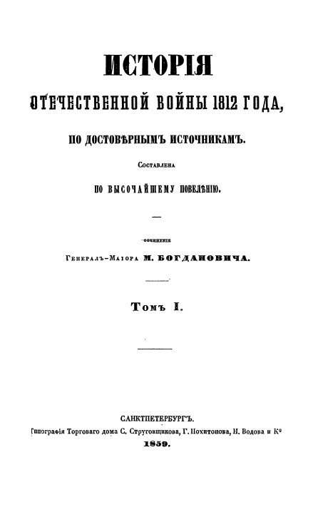 Выдающийся военный писатель и государственный деятель А.Н. Михайловский-Данилевский находился в гуще событий Отечественной войны 1812 , будучи адъютантом князя Кутузова. «Описание Отечественной войны» создано им в 1834—40 годах по Высочайшему повелению императора Николая I, когда он занимал должность сенатора и начальника военно-цензурного комитета. Это масштабное сочинение стало первой русской официальной историей 1812 г. Болей »