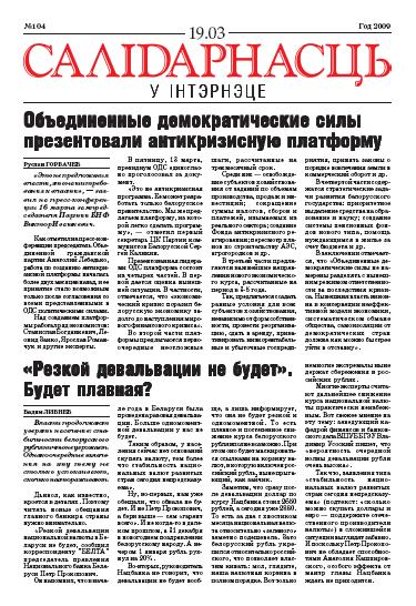 Объединенные демократические силы презентовали антикризисную платформу. «Это не предложения власти, это наши требо­вания к власти», — зая­вил на пресс-конферен­ции 16 марта зампред­седателя Партии БНФ Виктор Ивашкевич. Как отметил на пресс-кон­ференции председатель Объе­диненной гражданской партии Анатолий Лебедько, работа по созданию антикри­зисной платформы началась более двух месяцев назад, и ее принятие стало возможным только после согласования со всеми представленными в ОДС политическими силами. Над созданием платфор­мы работал ряд экономистов: Станислав Богданкевич, Ле­онид Заико, Ярослав Романчук и другие эксперты.