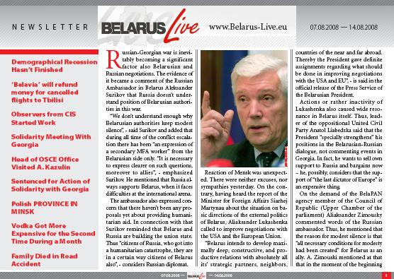 Russian-Georgian war is inevitably becoming a significant factor also Belarusian and Russian negotiations. The evidence of it became a comment of the Russian Ambassador in Belarus Aleksander Surikov that Russia doesn’t understand position of Belarusian authorities in this war. “We don’t understand enough why Belarusian authorities keep modest silence”, - said Surikov and added that during all time of the conflict escalation there has been “an expression of a secondary MFA worker” from the Belarusian side only. “It is necessary to express clearer on such questions, moreover to allies”, - emphasized Surikov. He mentioned that Russia always supports Belarus, when it faces difficulties at the international arena. The ambassador also expressed concern that there haven’t been any proposals yet about providing humanitarian aid. In connection with that Surikov reminded that Belarus and Russia are building the union state. Thus “citizens of Russia, who got into a humanitarian catastrophe, they are in a certain way citizens of Belarus also”, - considers Russian diplomat. Reaction of Mensk was unexpected.