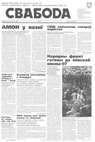 Свабода - самая масавая незалежная газэта ў Беларусі 1990-х гадоў. Выдавалася з 25 сакавіка 1990 па 1997 ў Менску. Газэта асьвятляла пытаньні грамадзка-палітычнага, эканамічнага, культурнага і духоўнага жыцьця Беларусі, знаёміла чытачоў з міжнароднымі падзеямі, друкавала матэрыялы па гісторыі Беларусі. Рэдакцыя выданьня стаяла на нацыянальна-дэмакратычных пазыцыях, крытычна адносілася да дзеючых на Беларусі органаў улады. Рэдакцыя лічыл... Болей »