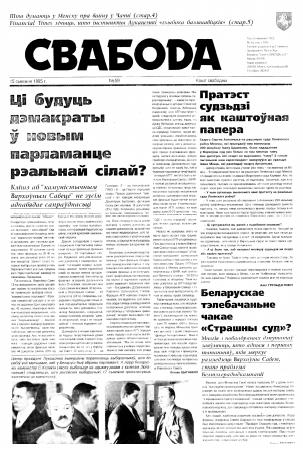 Свабода - самая масавая незалежная газэта ў Беларусі 1990-х гадоў. Выдавалася з 25 сакавіка 1990 па 1997 ў Менску. Газэта асьвятляла пытаньні грамадзка-палітычнага, эканамічнага, культурнага і духоўнага жыцьця Беларусі, знаёміла чытачоў з міжнароднымі падзеямі, друкавала матэрыялы па гісторыі Беларусі. Рэдакцыя выданьня стаяла на нацыянальна-дэмакратычных пазыцыях, крытычна адносілася да дзеючых на Беларусі органаў улады. Рэдакцыя лічыл... Болей »