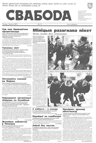 Свабода - самая масавая незалежная газэта ў Беларусі 1990-х гадоў. Выдавалася з 25 сакавіка 1990 па 1997 ў Менску. Газэта асьвятляла пытаньні грамадзка-палітычнага, эканамічнага, культурнага і духоўнага жыцьця Беларусі, знаёміла чытачоў з міжнароднымі падзеямі, друкавала матэрыялы па гісторыі Беларусі. Рэдакцыя выданьня стаяла на нацыянальна-дэмакратычных пазыцыях, крытычна адносілася да дзеючых на Беларусі органаў улады. Рэдакцыя лічыл... Болей »