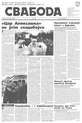 Свабода - самая масавая незалежная газэта ў Беларусі 1990-х гадоў. Выдавалася з 25 сакавіка 1990 па 1997 ў Менску. Газэта асьвятляла пытаньні грамадзка-палітычнага, эканамічнага, культурнага і духоўнага жыцьця Беларусі, знаёміла чытачоў з міжнароднымі падзеямі, друкавала матэрыялы па гісторыі Беларусі. Рэдакцыя выданьня стаяла на нацыянальна-дэмакратычных пазыцыях, крытычна адносілася да дзеючых на Беларусі органаў улады. Рэдакцыя лічыл... Болей »