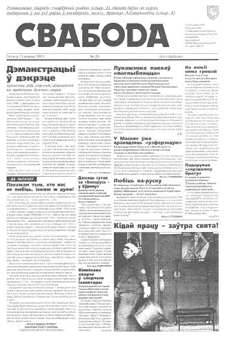 Свабода - самая масавая незалежная газэта ў Беларусі 1990-х гадоў. Выдавалася з 25 сакавіка 1990 па 1997 ў Менску. Газэта асьвятляла пытаньні грамадзка-палітычнага, эканамічнага, культурнага і духоўнага жыцьця Беларусі, знаёміла чытачоў з міжнароднымі падзеямі, друкавала матэрыялы па гісторыі Беларусі. Рэдакцыя выданьня стаяла на нацыянальна-дэмакратычных пазыцыях, крытычна адносілася да дзеючых на Беларусі органаў улады. Рэдакцыя лічыл... Болей »