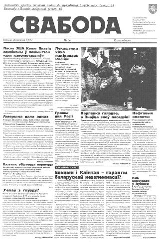 Свабода - самая масавая незалежная газэта ў Беларусі 1990-х гадоў. Выдавалася з 25 сакавіка 1990 па 1997 ў Менску. Газэта асьвятляла пытаньні грамадзка-палітычнага, эканамічнага, культурнага і духоўнага жыцьця Беларусі, знаёміла чытачоў з міжнароднымі падзеямі, друкавала матэрыялы па гісторыі Беларусі. Рэдакцыя выданьня стаяла на нацыянальна-дэмакратычных пазыцыях, крытычна адносілася да дзеючых на Беларусі органаў улады. Рэдакцыя лічыл... Болей »