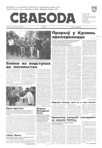 Свабода - самая масавая незалежная газэта ў Беларусі 1990-х гадоў. Выдавалася з 25 сакавіка 1990 па 1997 ў Менску. Газэта асьвятляла пытаньні грамадзка-палітычнага, эканамічнага, культурнага і духоўнага жыцьця Беларусі, знаёміла чытачоў з міжнароднымі падзеямі, друкавала матэрыялы па гісторыі Беларусі. Рэдакцыя выданьня стаяла на нацыянальна-дэмакратычных пазыцыях, крытычна адносілася да дзеючых на Беларусі органаў улады. Рэдакцыя лічыл... Болей »