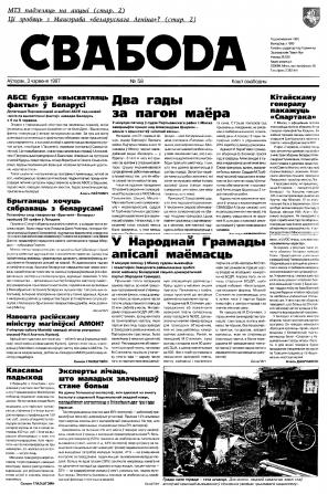 Свабода - самая масавая незалежная газэта ў Беларусі 1990-х гадоў. Выдавалася з 25 сакавіка 1990 па 1997 ў Менску. Газэта асьвятляла пытаньні грамадзка-палітычнага, эканамічнага, культурнага і духоўнага жыцьця Беларусі, знаёміла чытачоў з міжнароднымі падзеямі, друкавала матэрыялы па гісторыі Беларусі. Рэдакцыя выданьня стаяла на нацыянальна-дэмакратычных пазыцыях, крытычна адносілася да дзеючых на Беларусі органаў улады. Рэдакцыя лічыл... Болей »