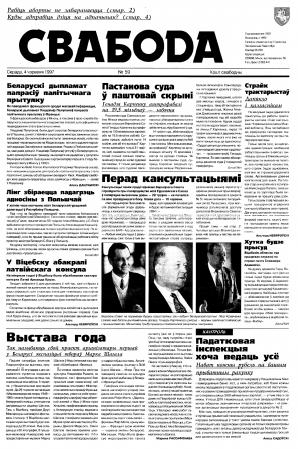 Свабода - самая масавая незалежная газэта ў Беларусі 1990-х гадоў. Выдавалася з 25 сакавіка 1990 па 1997 ў Менску. Газэта асьвятляла пытаньні грамадзка-палітычнага, эканамічнага, культурнага і духоўнага жыцьця Беларусі, знаёміла чытачоў з міжнароднымі падзеямі, друкавала матэрыялы па гісторыі Беларусі. Рэдакцыя выданьня стаяла на нацыянальна-дэмакратычных пазыцыях, крытычна адносілася да дзеючых на Беларусі органаў улады. Рэдакцыя лічыл... Болей »