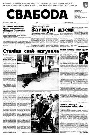 Свабода - самая масавая незалежная газэта ў Беларусі 1990-х гадоў. Выдавалася з 25 сакавіка 1990 па 1997 ў Менску. Газэта асьвятляла пытаньні грамадзка-палітычнага, эканамічнага, культурнага і духоўнага жыцьця Беларусі, знаёміла чытачоў з міжнароднымі падзеямі, друкавала матэрыялы па гісторыі Беларусі. Рэдакцыя выданьня стаяла на нацыянальна-дэмакратычных пазыцыях, крытычна адносілася да дзеючых на Беларусі органаў улады. Рэдакцыя лічыл... Болей »