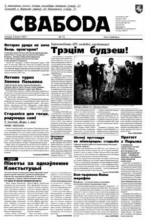 Свабода - самая масавая незалежная газэта ў Беларусі 1990-х гадоў. Выдавалася з 25 сакавіка 1990 па 1997 ў Менску. Газэта асьвятляла пытаньні грамадзка-палітычнага, эканамічнага, культурнага і духоўнага жыцьця Беларусі, знаёміла чытачоў з міжнароднымі падзеямі, друкавала матэрыялы па гісторыі Беларусі. Рэдакцыя выданьня стаяла на нацыянальна-дэмакратычных пазыцыях, крытычна адносілася да дзеючых на Беларусі органаў улады. Рэдакцыя лічыл... Болей »