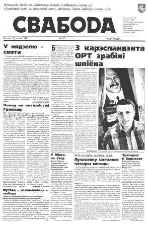 Свабода - самая масавая незалежная газэта ў Беларусі 1990-х гадоў. Выдавалася з 25 сакавіка 1990 па 1997 ў Менску. Газэта асьвятляла пытаньні грамадзка-палітычнага, эканамічнага, культурнага і духоўнага жыцьця Беларусі, знаёміла чытачоў з міжнароднымі падзеямі, друкавала матэрыялы па гісторыі Беларусі. Рэдакцыя выданьня стаяла на нацыянальна-дэмакратычных пазыцыях, крытычна адносілася да дзеючых на Беларусі органаў улады. Рэдакцыя лічыл... Болей »