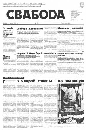 Свабода - самая масавая незалежная газэта ў Беларусі 1990-х гадоў. Выдавалася з 25 сакавіка 1990 па 1997 ў Менску. Газэта асьвятляла пытаньні грамадзка-палітычнага, эканамічнага, культурнага і духоўнага жыцьця Беларусі, знаёміла чытачоў з міжнароднымі падзеямі, друкавала матэрыялы па гісторыі Беларусі. Рэдакцыя выданьня стаяла на нацыянальна-дэмакратычных пазыцыях, крытычна адносілася да дзеючых на Беларусі органаў улады. Рэдакцыя лічыл... Болей »