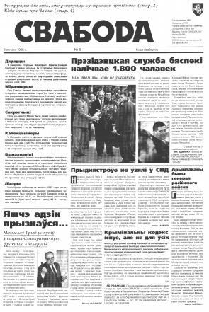 Свабода - самая масавая незалежная газэта ў Беларусі 1990-х гадоў. Выдавалася з 25 сакавіка 1990 па 1997 ў Менску. Газэта асьвятляла пытаньні грамадзка-палітычнага, эканамічнага, культурнага і духоўнага жыцьця Беларусі, знаёміла чытачоў з міжнароднымі падзеямі, друкавала матэрыялы па гісторыі Беларусі. Рэдакцыя выданьня стаяла на нацыянальна-дэмакратычных пазыцыях, крытычна адносілася да дзеючых на Беларусі органаў улады. Рэдакцыя лічыл... Болей »