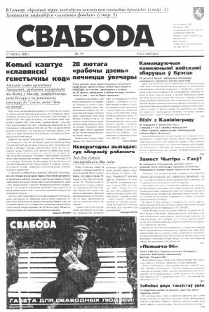 Свабода - самая масавая незалежная газэта ў Беларусі 1990-х гадоў. Выдавалася з 25 сакавіка 1990 па 1997 ў Менску. Газэта асьвятляла пытаньні грамадзка-палітычнага, эканамічнага, культурнага і духоўнага жыцьця Беларусі, знаёміла чытачоў з міжнароднымі падзеямі, друкавала матэрыялы па гісторыі Беларусі. Рэдакцыя выданьня стаяла на нацыянальна-дэмакратычных пазыцыях, крытычна адносілася да дзеючых на Беларусі органаў улады. Рэдакцыя лічыл... Болей »