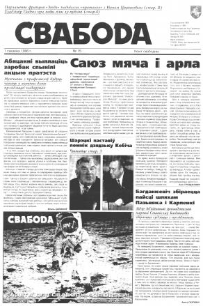 Свабода - самая масавая незалежная газэта ў Беларусі 1990-х гадоў. Выдавалася з 25 сакавіка 1990 па 1997 ў Менску. Газэта асьвятляла пытаньні грамадзка-палітычнага, эканамічнага, культурнага і духоўнага жыцьця Беларусі, знаёміла чытачоў з міжнароднымі падзеямі, друкавала матэрыялы па гісторыі Беларусі. Рэдакцыя выданьня стаяла на нацыянальна-дэмакратычных пазыцыях, крытычна адносілася да дзеючых на Беларусі органаў улады. Рэдакцыя лічыл... Болей »