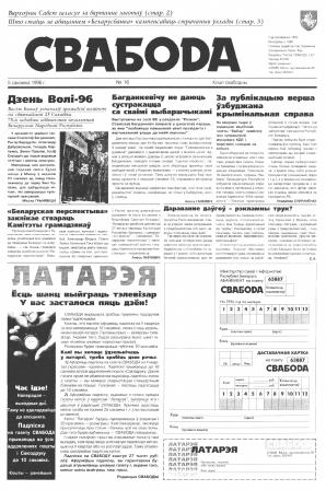 Свабода - самая масавая незалежная газэта ў Беларусі 1990-х гадоў. Выдавалася з 25 сакавіка 1990 па 1997 ў Менску. Газэта асьвятляла пытаньні грамадзка-палітычнага, эканамічнага, культурнага і духоўнага жыцьця Беларусі, знаёміла чытачоў з міжнароднымі падзеямі, друкавала матэрыялы па гісторыі Беларусі. Рэдакцыя выданьня стаяла на нацыянальна-дэмакратычных пазыцыях, крытычна адносілася да дзеючых на Беларусі органаў улады. Рэдакцыя лічыл... Болей »