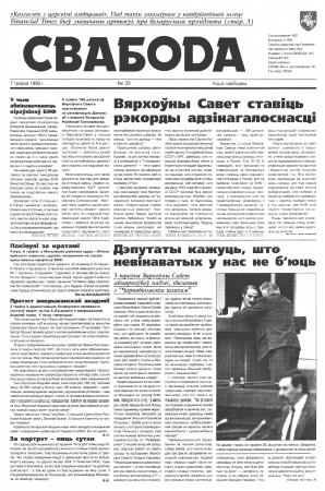 Свабода - самая масавая незалежная газэта ў Беларусі 1990-х гадоў. Выдавалася з 25 сакавіка 1990 па 1997 ў Менску. Газэта асьвятляла пытаньні грамадзка-палітычнага, эканамічнага, культурнага і духоўнага жыцьця Беларусі, знаёміла чытачоў з міжнароднымі падзеямі, друкавала матэрыялы па гісторыі Беларусі. Рэдакцыя выданьня стаяла на нацыянальна-дэмакратычных пазыцыях, крытычна адносілася да дзеючых на Беларусі органаў улады. Рэдакцыя лічыл... Болей »