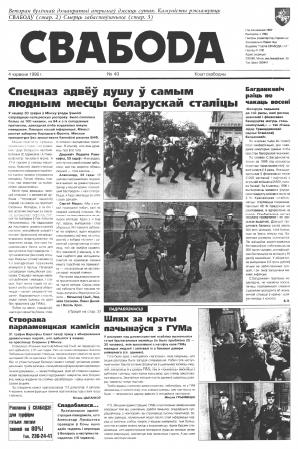 Свабода - самая масавая незалежная газэта ў Беларусі 1990-х гадоў. Выдавалася з 25 сакавіка 1990 па 1997 ў Менску. Газэта асьвятляла пытаньні грамадзка-палітычнага, эканамічнага, культурнага і духоўнага жыцьця Беларусі, знаёміла чытачоў з міжнароднымі падзеямі, друкавала матэрыялы па гісторыі Беларусі. Рэдакцыя выданьня стаяла на нацыянальна-дэмакратычных пазыцыях, крытычна адносілася да дзеючых на Беларусі органаў улады. Рэдакцыя лічыл... Болей »