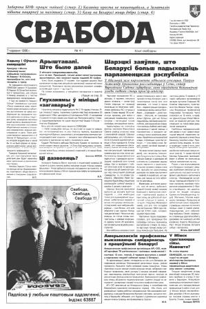 Свабода - самая масавая незалежная газэта ў Беларусі 1990-х гадоў. Выдавалася з 25 сакавіка 1990 па 1997 ў Менску. Газэта асьвятляла пытаньні грамадзка-палітычнага, эканамічнага, культурнага і духоўнага жыцьця Беларусі, знаёміла чытачоў з міжнароднымі падзеямі, друкавала матэрыялы па гісторыі Беларусі. Рэдакцыя выданьня стаяла на нацыянальна-дэмакратычных пазыцыях, крытычна адносілася да дзеючых на Беларусі органаў улады. Рэдакцыя лічыл... Болей »