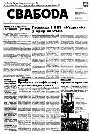 Свабода - самая масавая незалежная газэта ў Беларусі 1990-х гадоў. Выдавалася з 25 сакавіка 1990 па 1997 ў Менску. Газэта асьвятляла пытаньні грамадзка-палітычнага, эканамічнага, культурнага і духоўнага жыцьця Беларусі, знаёміла чытачоў з міжнароднымі падзеямі, друкавала матэрыялы па гісторыі Беларусі. Рэдакцыя выданьня стаяла на нацыянальна-дэмакратычных пазыцыях, крытычна адносілася да дзеючых на Беларусі органаў улады. Рэдакцыя лічыл... Болей »