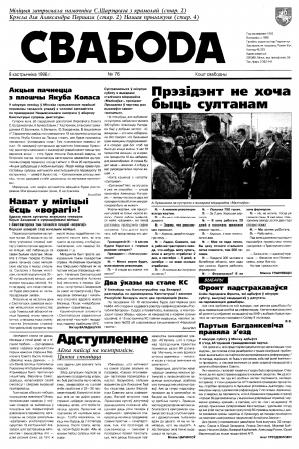 Свабода - самая масавая незалежная газэта ў Беларусі 1990-х гадоў. Выдавалася з 25 сакавіка 1990 па 1997 ў Менску. Газэта асьвятляла пытаньні грамадзка-палітычнага, эканамічнага, культурнага і духоўнага жыцьця Беларусі, знаёміла чытачоў з міжнароднымі падзеямі, друкавала матэрыялы па гісторыі Беларусі. Рэдакцыя выданьня стаяла на нацыянальна-дэмакратычных пазыцыях, крытычна адносілася да дзеючых на Беларусі органаў улады. Рэдакцыя лічыл... Болей »