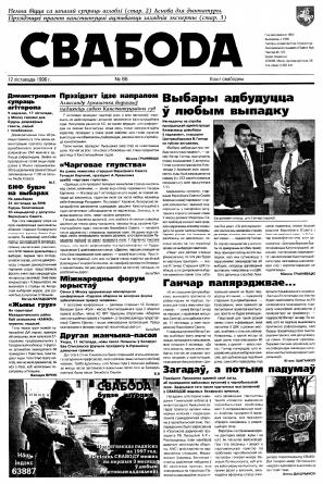 Свабода - самая масавая незалежная газэта ў Беларусі 1990-х гадоў. Выдавалася з 25 сакавіка 1990 па 1997 ў Менску. Газэта асьвятляла пытаньні грамадзка-палітычнага, эканамічнага, культурнага і духоўнага жыцьця Беларусі, знаёміла чытачоў з міжнароднымі падзеямі, друкавала матэрыялы па гісторыі Беларусі. Рэдакцыя выданьня стаяла на нацыянальна-дэмакратычных пазыцыях, крытычна адносілася да дзеючых на Беларусі органаў улады. Рэдакцыя лічыл... Болей »