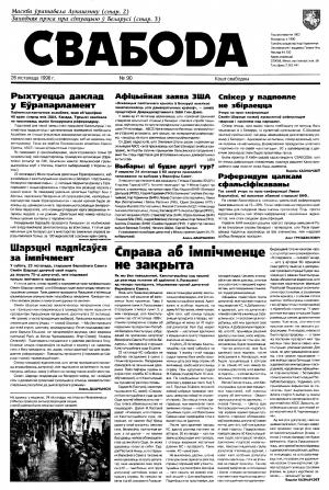 Свабода - самая масавая незалежная газэта ў Беларусі 1990-х гадоў. Выдавалася з 25 сакавіка 1990 па 1997 ў Менску. Газэта асьвятляла пытаньні грамадзка-палітычнага, эканамічнага, культурнага і духоўнага жыцьця Беларусі, знаёміла чытачоў з міжнароднымі падзеямі, друкавала матэрыялы па гісторыі Беларусі. Рэдакцыя выданьня стаяла на нацыянальна-дэмакратычных пазыцыях, крытычна адносілася да дзеючых на Беларусі органаў улады. Рэдакцыя лічыл... Болей »