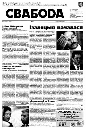 Свабода - самая масавая незалежная газэта ў Беларусі 1990-х гадоў. Выдавалася з 25 сакавіка 1990 па 1997 ў Менску. Газэта асьвятляла пытаньні грамадзка-палітычнага, эканамічнага, культурнага і духоўнага жыцьця Беларусі, знаёміла чытачоў з міжнароднымі падзеямі, друкавала матэрыялы па гісторыі Беларусі. Рэдакцыя выданьня стаяла на нацыянальна-дэмакратычных пазыцыях, крытычна адносілася да дзеючых на Беларусі органаў улады. Рэдакцыя лічыл... Болей »