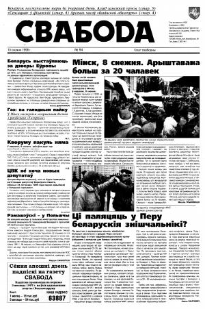 Свабода - самая масавая незалежная газэта ў Беларусі 1990-х гадоў. Выдавалася з 25 сакавіка 1990 па 1997 ў Менску. Газэта асьвятляла пытаньні грамадзка-палітычнага, эканамічнага, культурнага і духоўнага жыцьця Беларусі, знаёміла чытачоў з міжнароднымі падзеямі, друкавала матэрыялы па гісторыі Беларусі. Рэдакцыя выданьня стаяла на нацыянальна-дэмакратычных пазыцыях, крытычна адносілася да дзеючых на Беларусі органаў улады. Рэдакцыя лічыл... Болей »