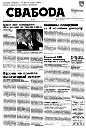 Свабода - самая масавая незалежная газэта ў Беларусі 1990-х гадоў. Выдавалася з 25 сакавіка 1990 па 1997 ў Менску. Газэта асьвятляла пытаньні грамадзка-палітычнага, эканамічнага, культурнага і духоўнага жыцьця Беларусі, знаёміла чытачоў з міжнароднымі падзеямі, друкавала матэрыялы па гісторыі Беларусі. Рэдакцыя выданьня стаяла на нацыянальна-дэмакратычных пазыцыях, крытычна адносілася да дзеючых на Беларусі органаў улады. Рэдакцыя лічыл... Болей »