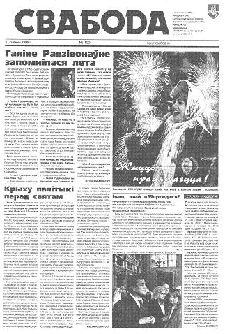 Свабода - самая масавая незалежная газэта ў Беларусі 1990-х гадоў. Выдавалася з 25 сакавіка 1990 па 1997 ў Менску. Газэта асьвятляла пытаньні грамадзка-палітычнага, эканамічнага, культурнага і духоўнага жыцьця Беларусі, знаёміла чытачоў з міжнароднымі падзеямі, друкавала матэрыялы па гісторыі Беларусі. Рэдакцыя выданьня стаяла на нацыянальна-дэмакратычных пазыцыях, крытычна адносілася да дзеючых на Беларусі органаў улады. Рэдакцыя лічыл... Болей »