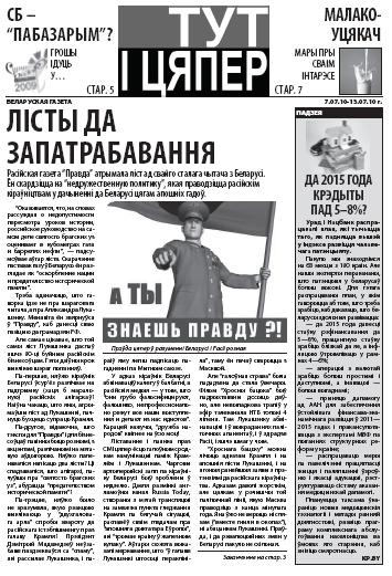 Лісты да запатрабавання. Расійская газета “Правда” атрымала ліст ад свайго сталага чытача з Беларусі. Ён скардзіцца на “недружественную политику”, якая праводзіцца расійскім кіраўніцтвам у дачыненні да Беларусі цягам апошніх гадоў. “Оказывается, что, на словах рассуждая о недопустимости пересмотра уроков истории, российское руководство на самом деле святость братских уз оценивает в кубометрах газа и баррелях нефти”, — падсумоўвае аўтар ліста. Скарачэнне паставак газу ў Беларусь ён разглядае як “оскорбление нации и предательство исторической памяти”. Трэба адзначыць, што гаворка ідзе не пра шараговага чытача, а пра Аляксандра Лукашэнку. Менавіта ён звярнуўся ў “Правду”, каб данесці сваю пазіцыю да грамадзян РФ. Але самае цікавае, што той самы ліст Лукашэнка даслаў яшчэ 80-ці буйным расійскім бізнесоўцам. Гэты дзіўны крок выклікае шэраг пытанняў. Па-першае, няўжо кіраўнік Беларусі ўсур’ёз разлічвае на падтрымку (хаця б маральную) расійскіх алігархаў? Наіўна чакаць, што яны, атрымаўшы ліст ад Лукашэнкі, пачнуць бухцець супраць Крамля.