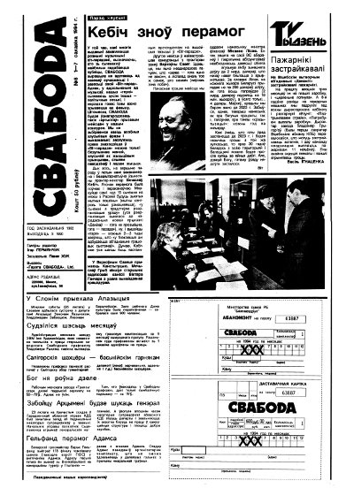 Свабода - самая масавая незалежная газэта ў Беларусі 1990-х гадоў. Выдавалася з 25 сакавіка 1990 па 1997 ў Менску. Газэта асьвятляла пытаньні грамадзка-палітычнага, эканамічнага, культурнага і духоўнага жыцьця Беларусі, знаёміла чытачоў з міжнароднымі падзеямі, друкавала матэрыялы па гісторыі Беларусі. Рэдакцыя выданьня стаяла на нацыянальна-дэмакратычных пазыцыях, крытычна адносілася да дзеючых на Беларусі органаў улады. Рэдакцыя лічыл... Болей »