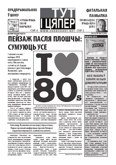 Пейзаж пасля Плошчы: сумуюць усе. У апошні момант выбары-2010 ператварыліся ў канец свету. Наступствы, хутчэй за ўсё, будуць кепскімі і для Аляксандра Лукашэнкі, і для апазіцыйных кандыдатаў. У нядзелю ў абед ужо было канчаткова зразумела, што выбары адбываюцца па стандартным сцэнарыі, які прадугледжвае каля 80% выбаршчыкаў, што нібыта аддалі галасы за дзеючага кіраўніка Беларусі. Пра тое, у прыватнасці, сведчылі вынікі экзітпулаў, якія агучылі праўладныя арганізацыі. У сваю чаргу апазіцыя атрымала падставы пачынаць пратэсты, не чакаючы афіцыйнага абвяшчэння вынікаў выбараў. Але ж усё адразу пайшло не па плане. Уладзімір Някляеў не паспеў адысці ад офіса і 100 метраў, як быў збіты да непрытомнасці. З чэрапнамазгавой траўмай яго забрала ў шпіталь “хуткая дапамога”. Знікненне Някляева парушыла і без таго хісткі баланс паміж апазіцыйнымі кандыдатамі ў прэзідэнты. Хаця на Кастрычніцкай плошчы сабралася не так мала народу, ніхто з палітыкаў не здолеў утрымаць лейцы ў сваіх руках. Скончылася гэта скамарошным штурмам Дома ўрада і жорсткай расправай у адказ.
