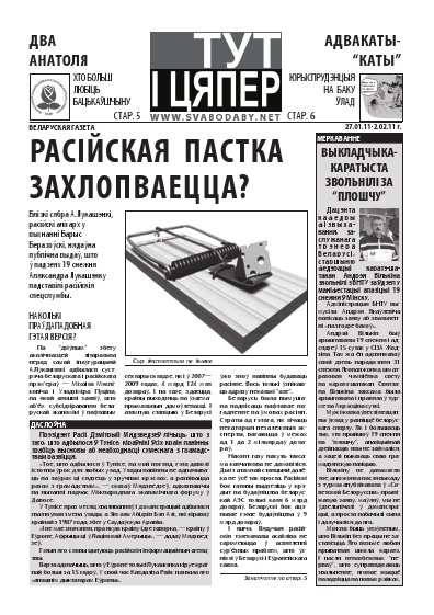 Расійская пастка захлопваецца. Блізкі сябра А.Лукашэнкі, расійскі алігарх у выгнанні Барыс Беразоўскі, нядаўна публічна выдаў, што ў падзеях 19 снежня Аляксандра Лукашэнку падставілі расійскія спецслужбы. Наколькі праўдападобная гэтая версія? Па “дзіўным” збегу акалічнасцей літаральна перад самай інаўгурацыяй А.Лукашэнкі адбылася сустрэча беларускага і расійскага прэм’ераў — Міхаіла Мясніковіча і Уладзіміра Пуціна, на якой апошні заявіў, што аб’ём субсідзіравання беларускай эканомікі ў нафтавым сектары складзе, як і ў 2007— 2009 гадах, 4 млрд 124 млн долараў. І па газе, здаецца, краіны выходзяць на ўзаемапрымальныя дамоўленасці. І атамную станцыю ў Беларусі ўжо зноў павінны будаваць расіяне. Вось толькі ўзнікаюць адразу некалькі “але”. Беларусь была вымушана падпісаць нафтавае пагадненне на ўмовах расіян. Страты ад гэтага, як лічаць некаторыя незалежныя эксперты, вагаюцца ў межах ад 1 да 2 мільярдаў долараў.