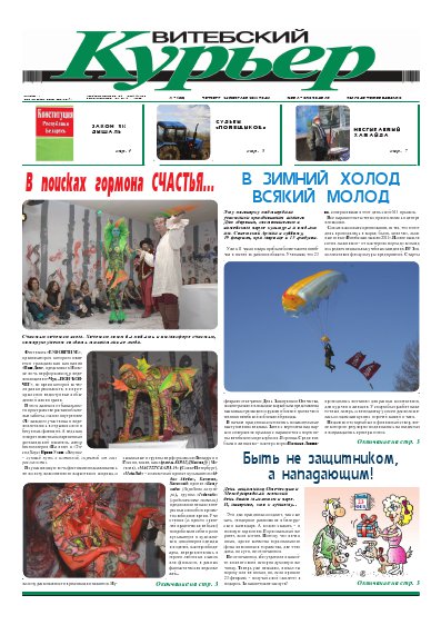 Уважаемые читатели газеты «ВИТЕБСКИЙ КУРЬЕР», информационные, познавательные издания, администрации интернет-ресурсов, масс-медиа, перед вами электронная версия номера нашей газеты, открытого для свободного доступа. При перепечатке, ссылка на нашу газету или сайт обязательна! Все авторские права защищены. Наша редакция знакомится с письмами читателей, не вступая в переписку. Рукописи не рецензируются и не возвращаются. Наша редакция не ... Болей »