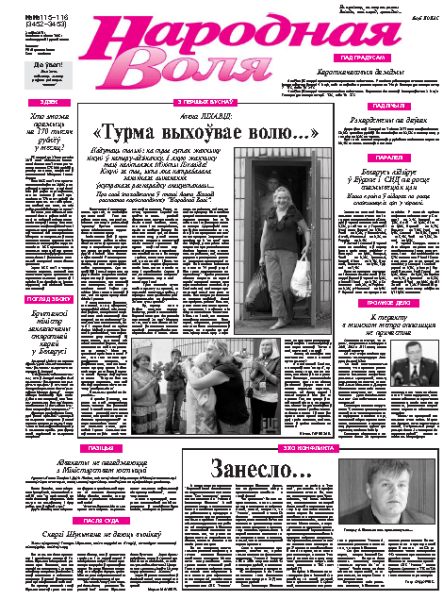 Падумаць толькі: на трое сутак жанчыну кінулі ў камеру-адзіночку. I якую жанчыну — маці палітвязня Мікіты Ліхавіда! Кінулі за тое, што яна патрабавала законнага выканання ўнутранага распарадку спецустановы... Пра сваё знаходжанне ў няволі Алена Ліхавід распавяла карэспандэнту “Народнай Волі”. — Напачатку я б хацела расказаць пра тое, як адбываўся суд нада мной. — Гэта сапраўдны спектакль, дзе ролі адведзены кожнаму з удзельнікаў “працэсу”. Прычым законныя правы абвінавачанага парушаюцца на кожным кроку. Адбывалася ўсё ў судзе Цэнтральнага раёна сталіцы. Яшчэ да пачатку судовага працэсу я патрабавала сустрэчы сам-насам са сваім адвакатам Дар’яй Ліпкінай. Мне беспадстаўна адмовілі. У ходзе судовага працэсу адвакат стала патрабаваць, каб нам далі канфідэнцыйна перагаварыць. Суд адмовіў і ёй. І толькі пасля таго, як Дар’я Ліпкіна папрасіла занесці гэтую адмову ў пратакол судовага пасяджэння, суд дазволіў нам пагаварыць сам-насам у асобным пакоі. Роўна тры хвіліны. Мне таксама адмовілі ў тым, каб на судзе прысутнічалі блізкія і родныя.