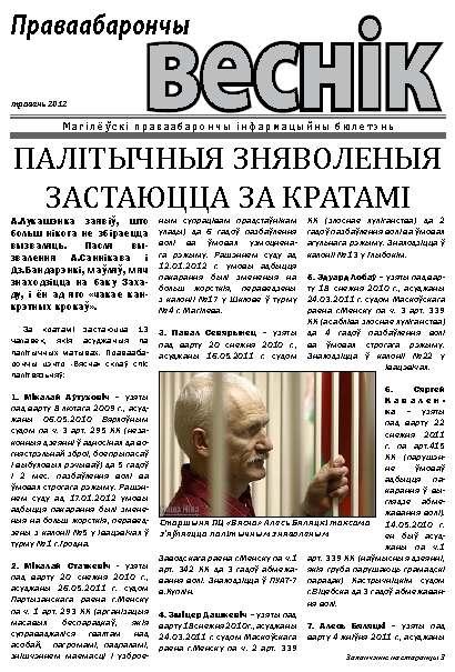 У нумары праваабарончага бюлетэню Магілёўскага аддзялення ПЦ "Вясна" за чэрвень - матэрыялы пра вызваленне Алеся Бяляцкага, судовую практыку і праблемы магілёўскіх праваабаронцаў. Як заўсёды, нумар даступны ў электронным выглядзе на нашым сайце. Калі вы хочаце атрымаць папяровую версію - паведаміце нам на электронную пошту info@mahilyowspring.org ваш паштовы адрас, і мы дашлем вам бюлетэнь поштай. Інфармацыйны бюлетэнь распаўсюджваецца ... Болей »
