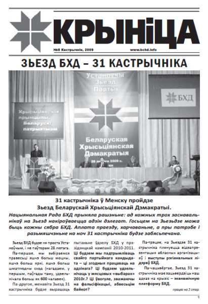 Выйшаў 32-ы нумар газэты "Крыніца" – партыйнага бюлетэню "Беларускай Хрысьціянскай Дэмакратыі". Нумар прысьвечаны ўстаноўчым сходам Маладых Хрысціянскіх эмакратаў і Хрысціянскіх Дэмакратаў Віцебшчыны, праблеме вызвалення палітвязняў, асвятленьню дзейнасьці БХД за апошні час і шмат іншых цікавых матэрыялаў. Болей »