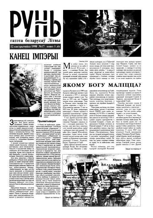 «Рунь» - беларуская газэта ў Вільні. Выдаецца з 1997 году і выходзіць нерэгулярна. Друкуецца кірыліцаю (клясычным правапісам) і лацінкаю. Выдавец: «Віленскі цэнтар грамадзкіх ініцыятываў Дэмакратыя для Беларусі». Рэдакцыя моха друкаваць матар´ялы, што адлюстроўваюць суджэньне толькі іхных аўтараў. Меркаваньні рэданцыі не заўсёды супадаюць з аўтарскімі пазыцыямі. More »