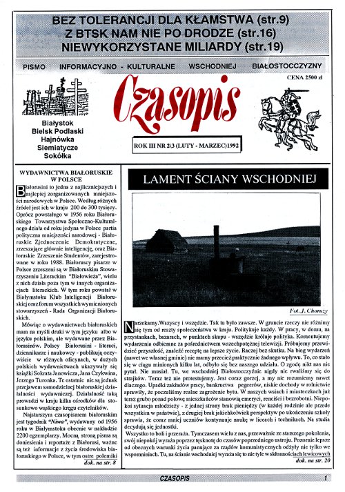 Czasopis (biał. Часопіс) – wychodzący od 1990 roku białoruski miesięcznik społeczno-kulturalny, wydawany w Białymstoku w języku polskim i białoruskim przez Stowarzyszenie Dziennikarzy Białoruskich. Redaktorem naczelnym jest Jerzy Chmielewski. Pismo dofinansowywane jest przez Ministerstwo Administracji i Cyfryzacji. Magazyn porusza kwestie istotne dla mniejszości białoruskiej zamieszkującej w Polsce. Publikuje reportaże, teksty literacki... Болей »