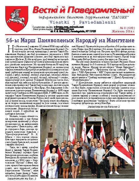 На Мангэтане ў нядзелю 13 ліпеня 2014 году адбыўся чарговы, ужо 56-ы, Марш Паняволеных Народаў. Гэтая імпрэза штогод праводзіцца ў рамках Тыдню Паняволеных Народаў, які быў усталяваны, пачынаючы з 1959 году адмысловым урадавым законам, што быў падпісаны прэзыдэнтам Дўайтам Д. Айзэнгаўэрам, і даў пляцоўку эміграцыйным арганізацыям ўцекачоў ад Саветаў для выказваньня нязгоды з расейскім камунізмам. На працягу больш як 50 гадоў пад кіраўніцтвам Камітэту Паняволеных Народаў, на кожны трэці тыдзень ліпеня Нью-Ёрк рабіўся трыбунай масавых дэманстрацыяў і публічных акцыяў амэрыканскіх арганізацыяў чэхаў, латышоў, сэрбаў, палякаў, венграў, украінцаў, славакаў, летувісаў, румынаў, эстонцаў, татараў, казакоў, каўказцаў – словам, прадстаўнікоў усіх краінаў Усходняй Эўропы ды часткі Азіі, якія падгроб пад сябе маскоўскі бальшавізм. У рамках адмысловых мерапрыемстваў Тыдня былі такія акцыі, як пікеты каля савецкіх прадстаўніцтваў у Нью-Ёрку, Лос-Анджэлясе й Вашынгтоне, дэманстрацыя Паняволеных Народаў у 1976 годзе каля Статуі Свабоды на 200"годзьдзе ЗША.