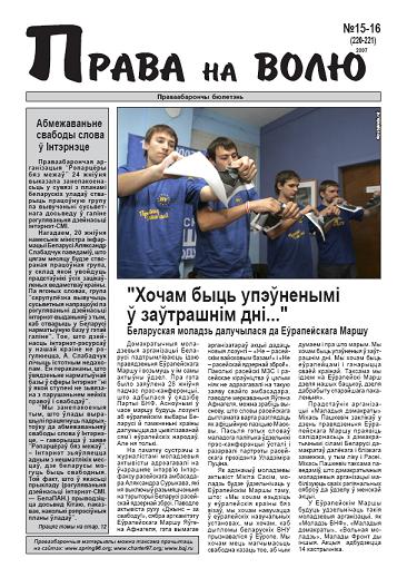 Абмежаваньне свабоды слова ў Інтэрнэце Праваабарончая арганізацыя “Рэпарцёры бяз межаў” 24 жніўня выказала занепакоенасьць у сувязі з планамі беларускіх уладаў стварыць працоўную групу па вывучэньні сусьветнага досьведу ў галіне рэгуляваньня дзейнасьці інтэрнэт-СМІ. Нагадаем, 20 жніўня намесьнік міністра інфармацыі Беларусі Аляксандр Слабадчук паведаміў, што цягам месяцу будзе створаная працоўная група, у склад якой увойдуць прадстаўнікі ўсіх зацікаўленых ведамстваў краіны. Па ягоных словах, група “скрупулёзна вывучыць сусьветныя напрацоўкі па рэгуляваньні дзейнасьці інтэрнэт-выданьняў з тым, каб стварыць у Беларусі нарматыўную базу ў гэтай галіне”. Тое, што дзейнасць інтэрнэт-рэсурсаў у нашай краіне не рэгулюецца, А. Слабадчук лічыць істотным недахопам. Ён перакананы, што ўвядзеньне нарматыўнай базы ў сферы Інтэрнэт “ні ў якой ступені не зьвязана з парушэньнем нейкіх правоў і свабодаў”.