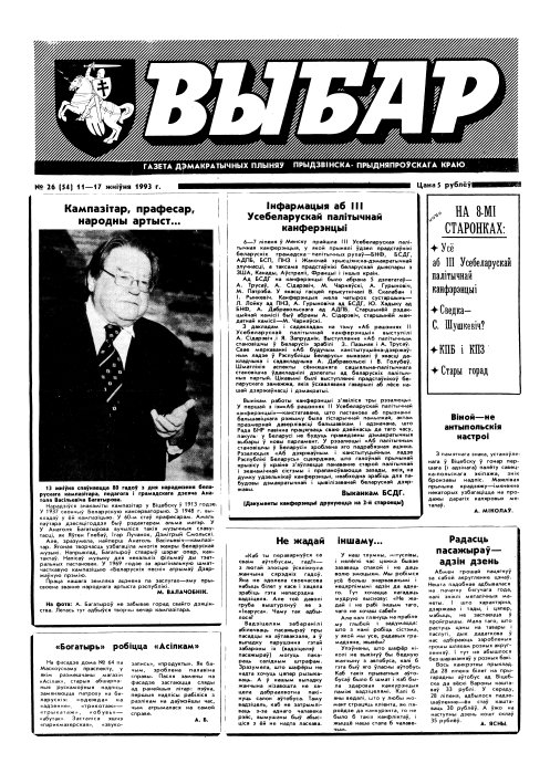 Газэта “Выбар” выдавалася ў Віцебску з 1991 году. Гэта бадай самае першае віцебскае дэмакратычнае выданьне. Сваю мэту рэдакцыя газэты ў яе першым нумары з 2 кастрычніка 1991 году фармулявала наступным чынам: Будзем дапамагаць новым і перагленуўшым свае мінулыя пазыцыі старым грамадзкім сілам выцягваць Беларусь з 73-гадовай пустыні, падносіць з каленяў змучаны і чакаючы чарговых сацыяльна-эканамічных крызісаў народ для пабудовы сапраўдна... More »