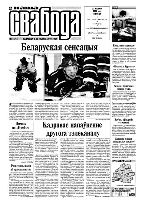 Наша Свабода — грамадска-палітычная газета, якая выдавалася пад гэтай назвай з 2000 па 2002 ў Мінску на беларускай мове. Заснавальнік, галоўны і першы рэдактар — Павел Жук. 24 лістапада 1997 году Вышэйшы гаспадарчы суд зьліквідаваў газэту «Свабода». З 16 студзеня 1998 году «Свабода» пачала выходзіць пад назвай «Навіны». 24 верасьня 1999 году суд задаволіў зыск Дзяржаўнага сакратара Рады Бясьпекі Віктара Шэймана да газэты й журналіста Ся... Болей »