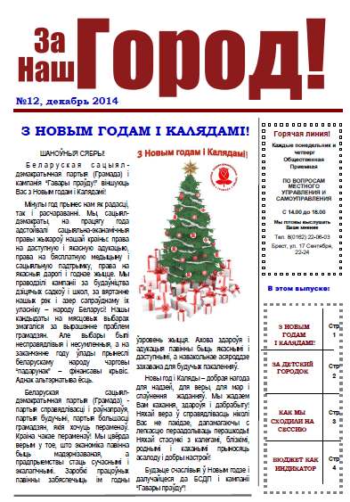 Беларуская сацыял-дэмакратычная партыя (Грамада) і кампанія ―Гавары праўду!‖ віншуюць Вас з Новым годам і Калядамі! Мінулы год прынес нам як радасці, так і расчараванні. Мы, сацыялдэмакраты, на працягу года адстойвалі сацыяльна-эканамічныя правы жыхароў нашай краіны: права на даступную і якасную адукацыю, права на бясплатную медыцыну і сацыяльную падтрымку, права на якасныя дарогі і годнае жыцце. Мы праводзілі кампаніі за будаўніцтва дзіцячых садкоў і школ, за вяртанне нашых рэк і азер сапраўднаму іх уласніку – народу Беларусі! Нашы кандыдаты на мясцовых выбарах змагаліся за вырашэнне праблем грамадзян. Але выбары былі несправядлівыя і несумленныя, а на заканчэнне году ўлады прынеслі беларускаму народу чарговы ―падарунак‖ – фінансавы крызіс. Аднак альтэрнатыва ѐсць.